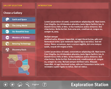 Touch screen designs for the Sultan Bin Abdul Aziz Science and Technology Centre in Saudi Arabia while working as an independent communications designer in a nine months contract at The Lunny Communications Group Interactive Division.